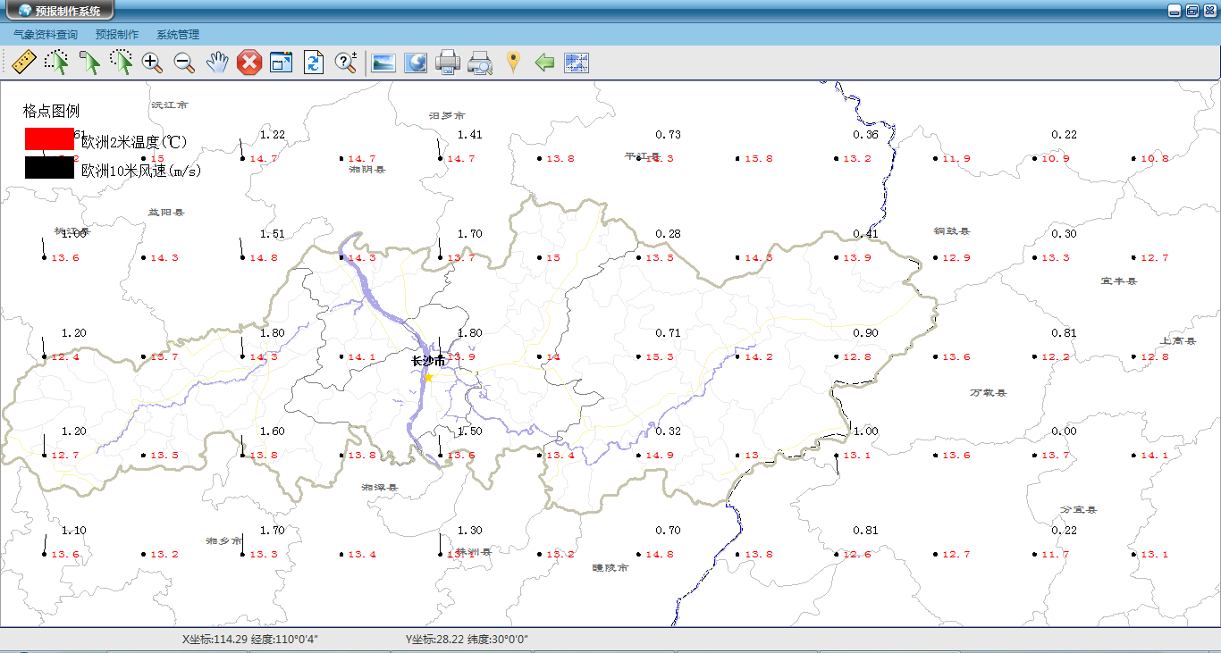 气象产品制作系统实现全市或各监测站点的未来7天逆温、混合层高度、气温、降水量、相对湿度、风向风速、云量等数据的插值计算,完成各类气象产品的定制制作。