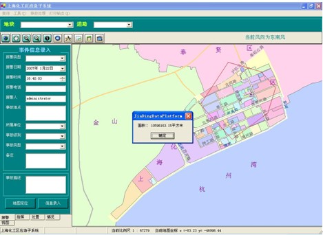 1 接警:接警系统供应急办接警人员使用。当接到新的警情,使用人员按照系统里列出的栏目将相关信息一一填入,并根据报警人员的描述,在地图上标示出事故发生地,点击“信息录入”按钮后系统将这些信息自动发送至各单位,各单位通过获取的信息进行出警任务的布置。